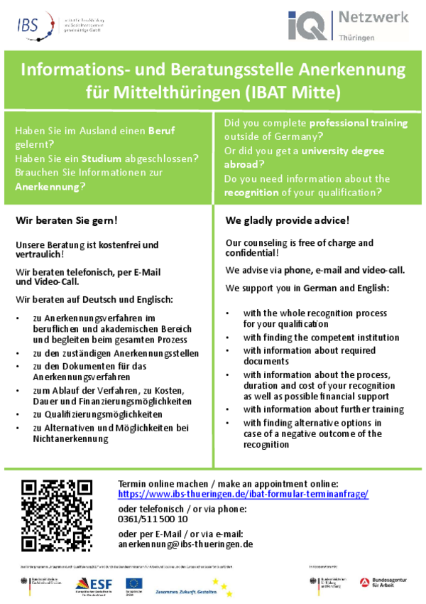 Die Informations- und Beratungsstelle zur Anerkennung in Thüringen-Mitte (IBAT-Mitte) ist Teil des IQ-Netzwerkes und wird gefördert durch das Bundesministerium für Arbeit und Soziales sowie den Europäischen Sozialfonds.
