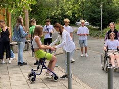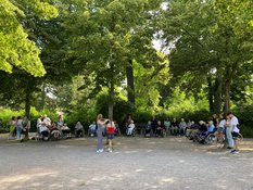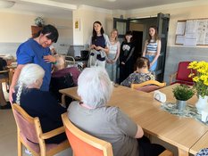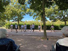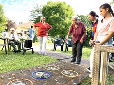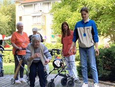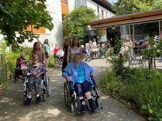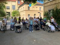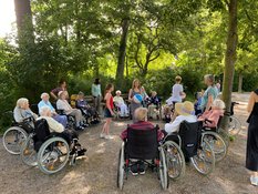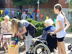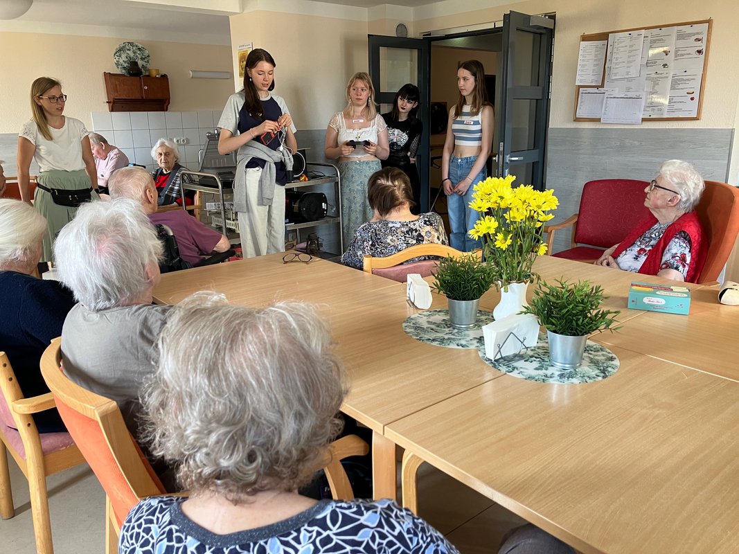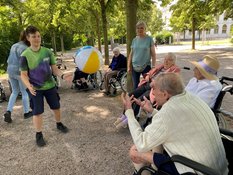 Für Charlotte Lückhoff, Leiterin Sozialer Dienst im Seniorenpflegeheim Sophienhaus, ist der Tag noch „viel, viel besser gelaufen als erwartet“. Begleitet von16 Freiwilligen aus dem Goethegymnasium und einigen Altenpflegerinnen konnten fast 20 Seniorinnen und Senioren Sonne und Natur bei Musik und Spiel im Freien genießen. „Ich finde es total gut, wie ihr das gemacht habt“, lobte Charlotte Lückhoff die hoch motivierten Jugendlichen bei der Abschlussrunde. Eine weitere Kooperation mit der Klasse ist geplant.