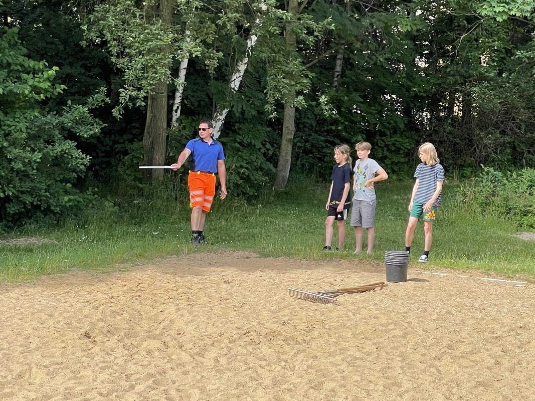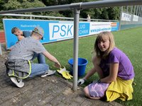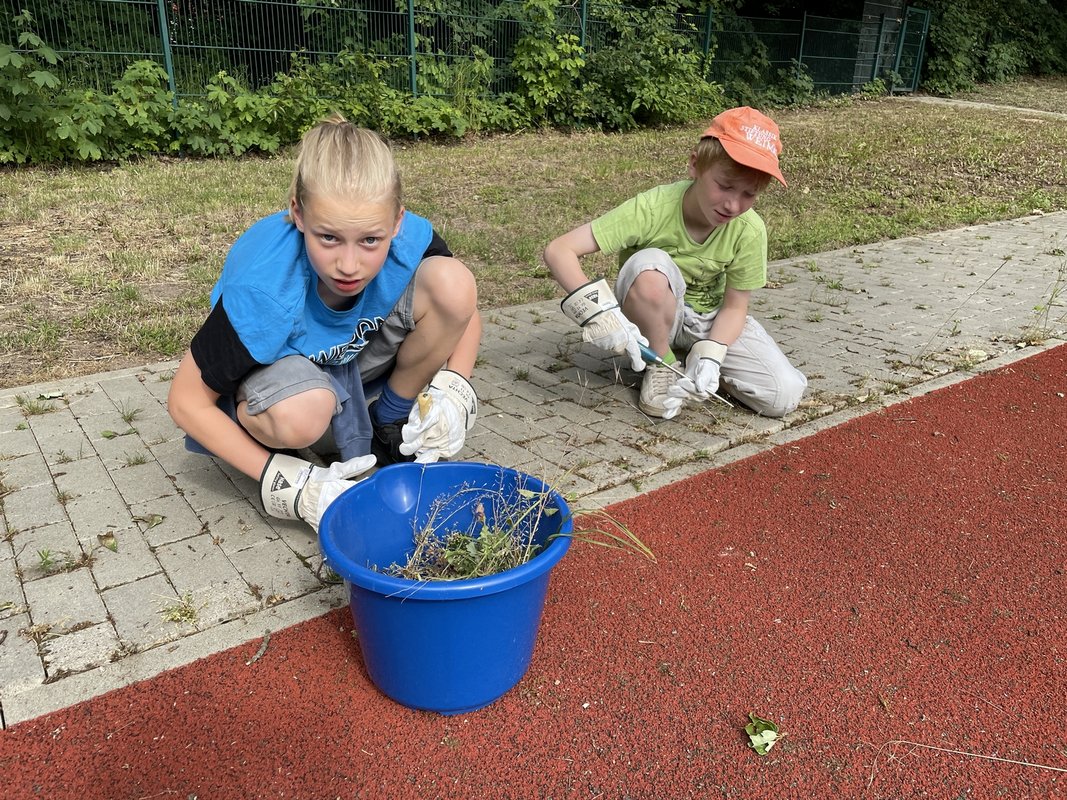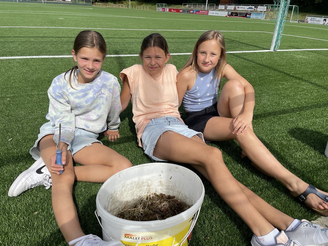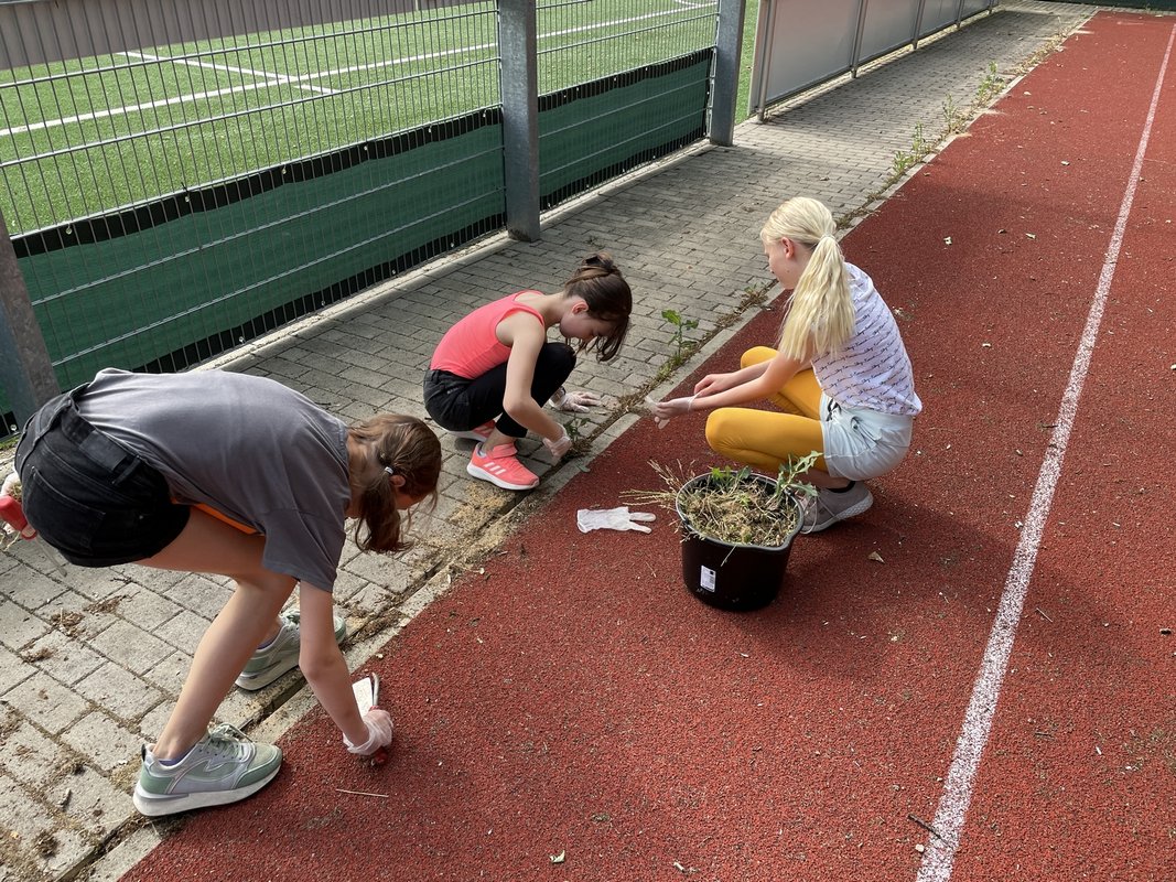 Auf dem Schöndorfer Sportplatz rückten 19 Kinder der 5a (Goethegymnasium) dem Unkraut, das am Rande des modernen Kunstrasenplatzes, bzw. rund ums Vereinsgebäude sprießt, zu Leibe. Eine nur halbdankbare Aufgabe – Unkraut kommt leider immer wieder. Die Mühen wurden jedoch mit einer Bratwurst und Bolzen auf dem Sportfeld des SV Schöndorf 1949 e.V. belohnt.