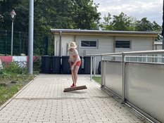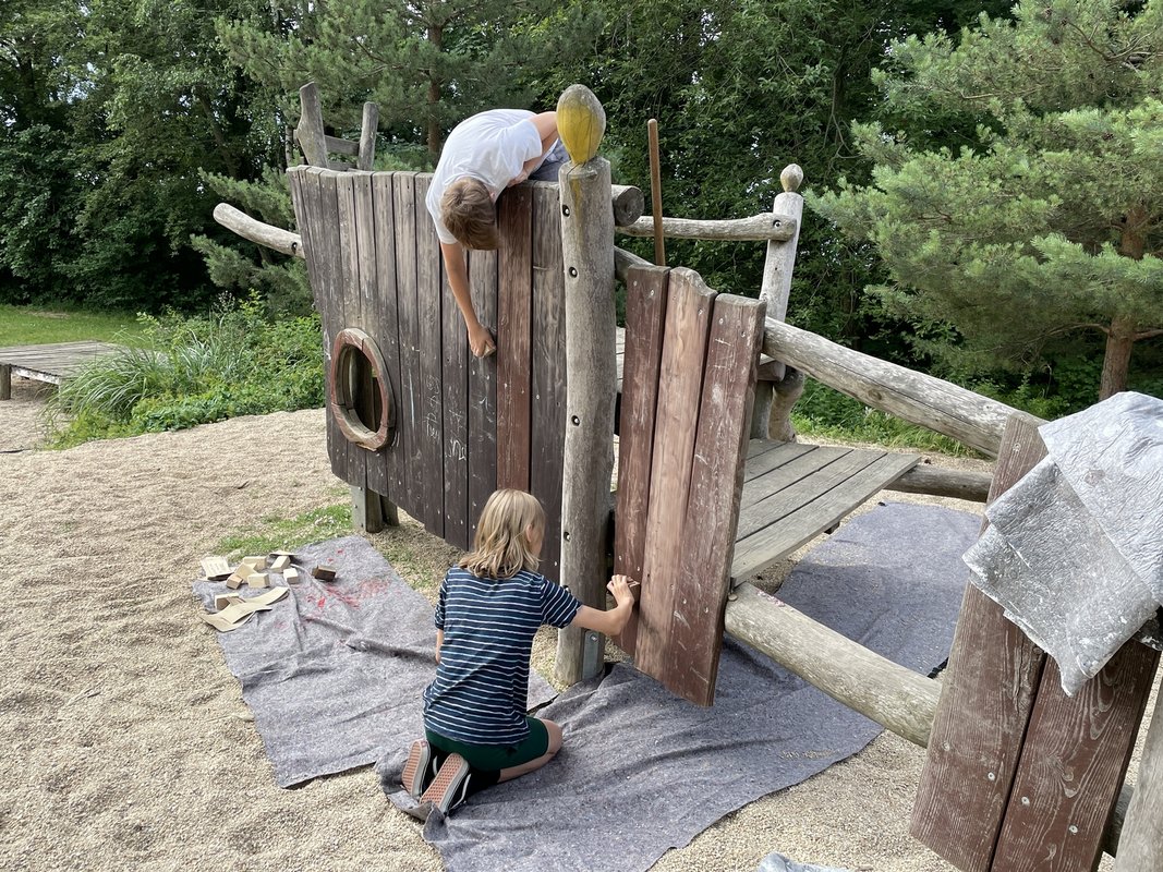 Im Jugendclub Café Conti, ebenfalls Schöndorf, wurde das in die Jahre gekommene Kletter-Piratenschiff renoviert. Abschleifen und den Neuanstrich vorbereiten, lautete die Aufgabe. Professionelle Hilfe des Kommunalservice Weimar – Abt. Spielplätze, übernahm den Feinschliff des Projekts, während die Einkaufs-Beauftragten für die Verköstigung der Truppe sorgten. Es gab lecker angerichtetes Obst in allen Varianten.
