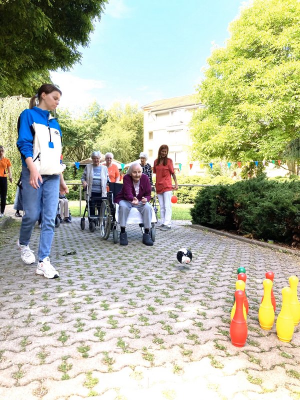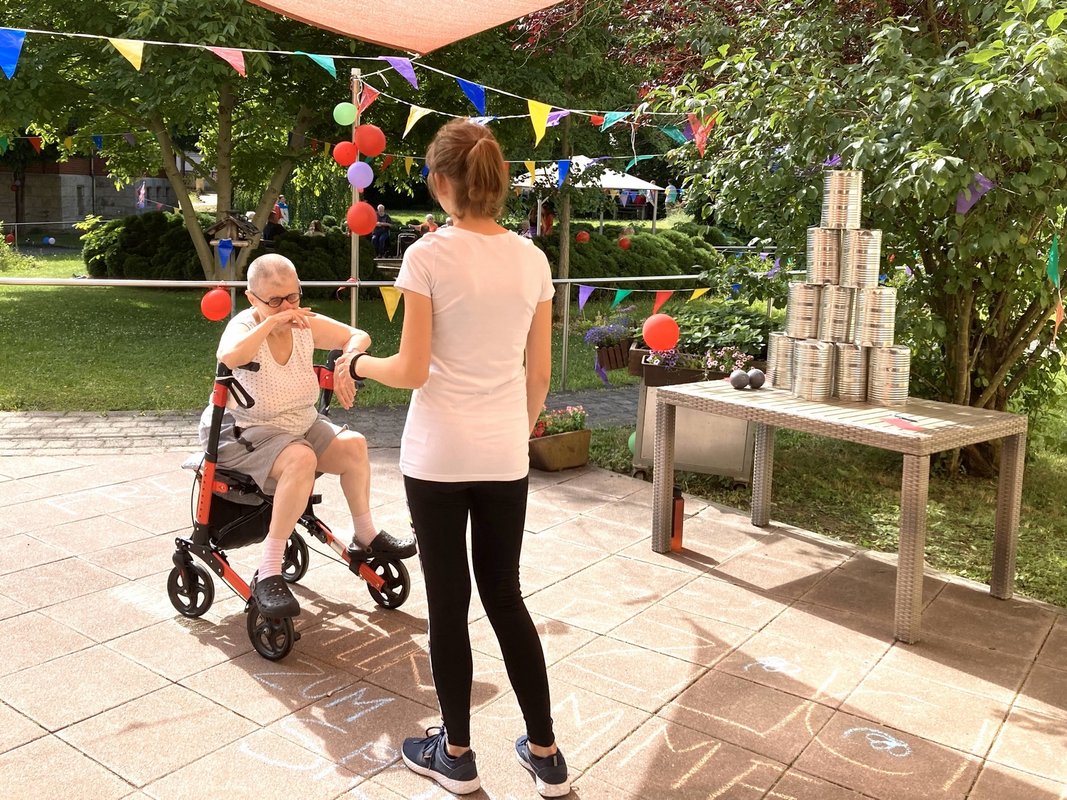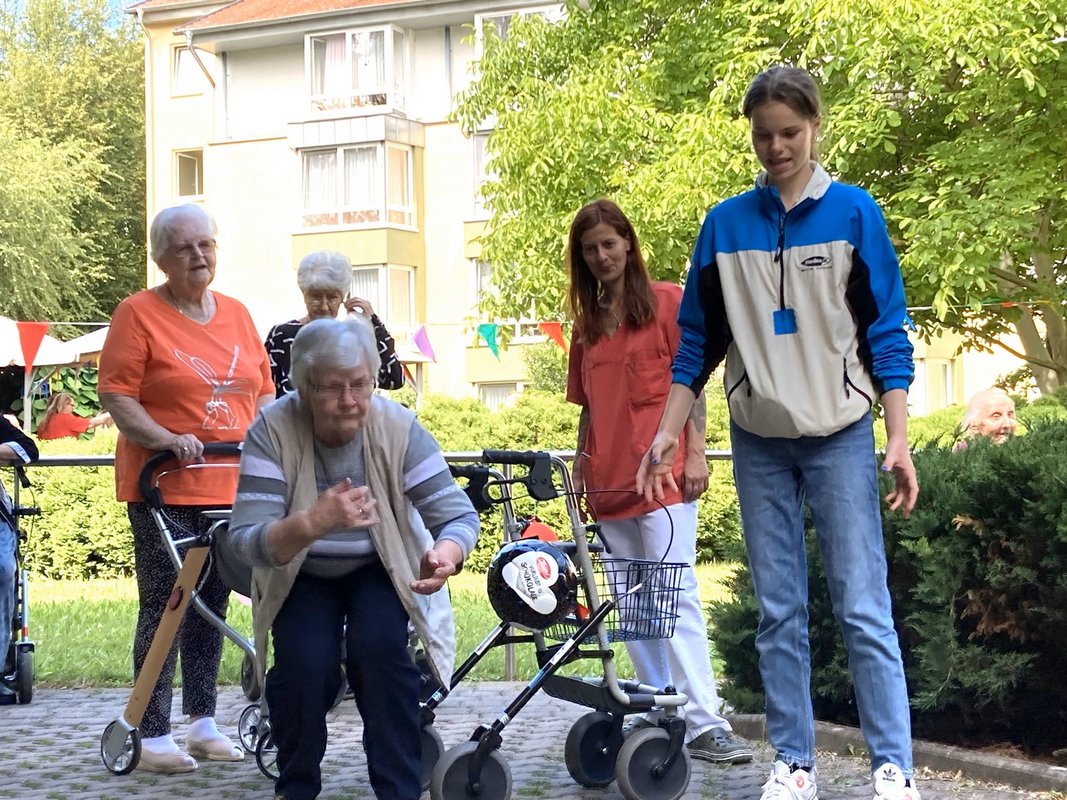 Im Rotkreuz-Heim in der Haußknechtstraße ging es sportlich zu. Die Klasse 7c des Goethegymnasiums unterstützte einzelne Sportstationen, an denen die meist hochaltrigen Bewohner ihre Geschicklichkeit und Fitness beweisen konnten. Ein schöner Spaß für jung und alt.