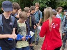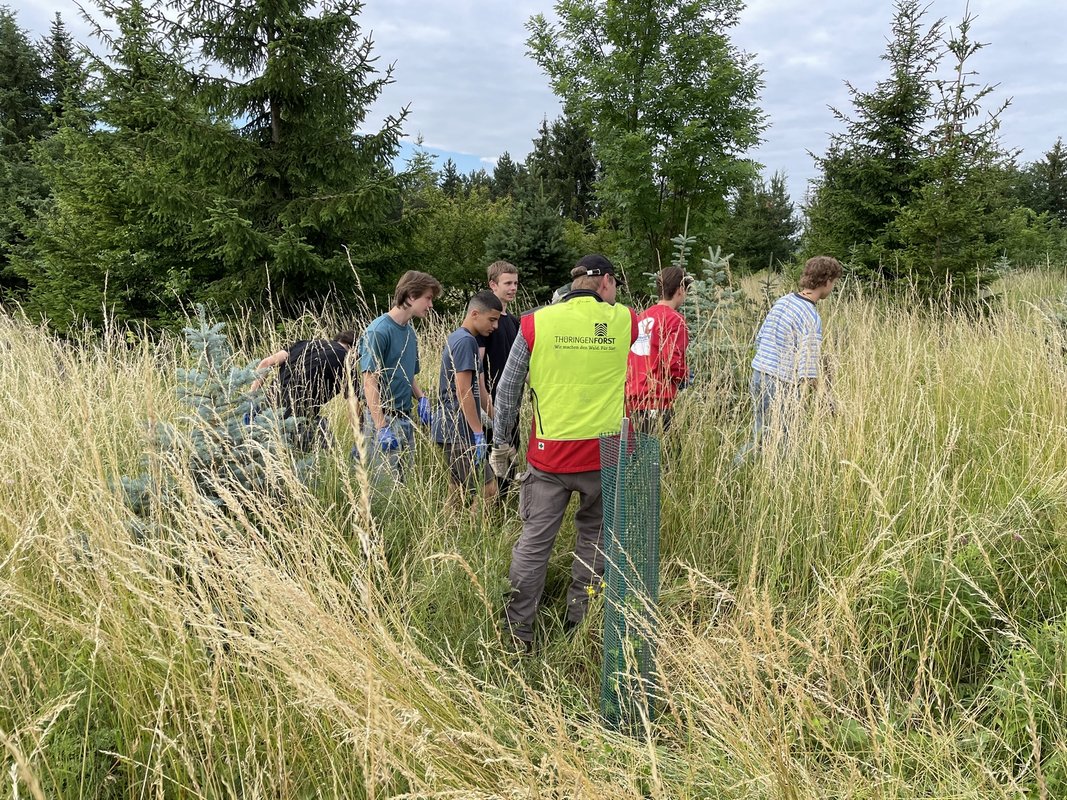 Im Forstprojekt Stadtwerke-Wald auf der Marienhöhe sorgten 30 Schülerinnen und Schüler aus der 5. und 9. Klasse des Goethegymnasiums, sowie der 8. Klasse des Schillergymnasiums, angeleitet von Mitarbeitern von ThüringenForst, für mehr Licht und Luft rund um die neugepflanzten Bäumchen. Das neu entstehende Waldgebiet ist gleichzeitig ein Testfeld für klimaresistentere Arten, wie Elsbeere, Ahorn oder Akazie und bedarf regelmäßiger Pflege. Die fleißigen Helfer*innen wurden von den Stadtwerken dafür extra mit Handschuhen ausgestattet.