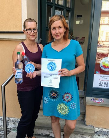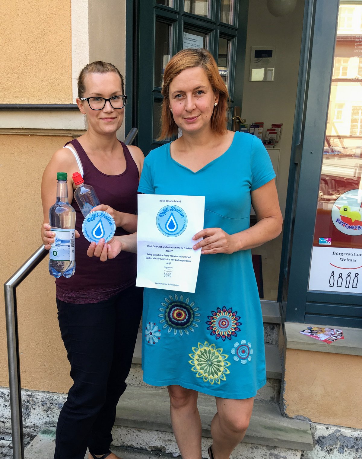 Die Initiatorinnen der EhrenamtsAgentur und vom Projekt Weimars Gute Nachbarn testen dies nun vor Ort aus. Schon bald werden in der Teichgasse 12a auch für andere Interessenten Refill-Aufkleber zum Abholen bereit liegen. An diesen erkennt man teilnehmende Ladengeschäfte oder Einrichtungen.