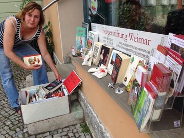 Bücher ans Licht. Unser Sortiment vorm Laden der EhrenamtsAgentur verändert sich täglich. Kinderbücher, Esoterik, Krimis, altes, neues, Kinkerlitzchen... Was da ist und gefällt, kann mitgenommen werden.