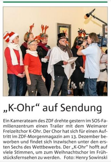 Nachdem der Anlauf zum beliebtesten Chor Thüringens gewählt zu werden (TLZ-Aktion im Frühjahr 2013), leider nicht von Erfolg gekrönt war, stehen die Chancen diesmal sehr gut für eine gemeinsame Reise ins ZDF-Studio nach Berlin.