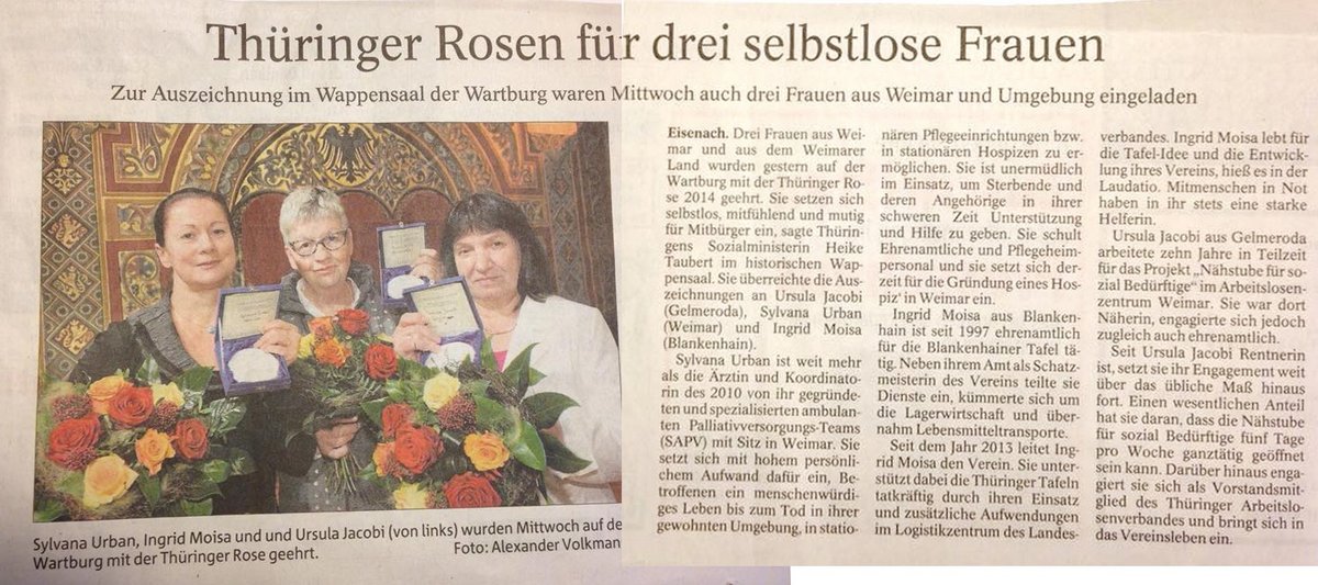 Verleihung Thüringer Rose - Herzlichen Glückwunsch den Gewinnerinnen! 11.11.2014 Klick auf das Bild vergrößert die Ansicht! Zurück Sylvana Urban, Ingird Moisa und Ursula Jacobi (v.l.) wurden Mittwoch auf der Wartburg mit der Thüringer Rose geehrt. Foto: Alexander Volkmann, TA