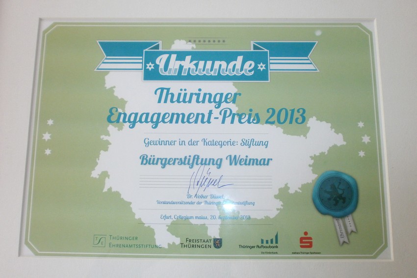 Die Bürgerstiftung Weimar erhält den Preis für ihr 10jähriges Engagement für soziale und kulturelle Projekte. Mehr als 100 Stifter unterstützen Jugendliche in Notlagen und Kinder mit Lernschwierigkeiten, finanzieren z.B. Film- oder Bandprojekte. Gewürdigt wurde auch die Arbeit der Ehrenamtsagentur und das Seniorenprojekt „Weimars gute Nachbarn“. In seiner Laudatio sagte der Vorsitzende des Bundesverbands der deutschen Stiftungen, Prof. Dr. Hans Fleisch: „Die Bürgerstiftung Weimar ist ein Vorbild für viele andere deutsche Bürgerstiftungen.“ Hier entstünden so viele gute Ideen, die könne man anderen Stiftungen nur empfehlen.