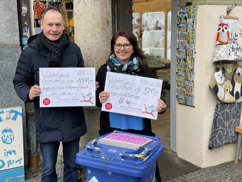 An der mit der Wichtelpost verbundenen Spendenaktion beteiligten sich die Firmen „Schmuck & Design - Susanne Schmidt“ und das Ingenieurbüro Katzung. Beide übernahmen Wichtelpost-Spendenpatenschaften in Höhe von insgesamt 1500 €, die nun dem Ferienpass Weimar, bzw. dem Kinder- und Jugendfonds der Bürgerstiftung Weimar zu Gute kommen.