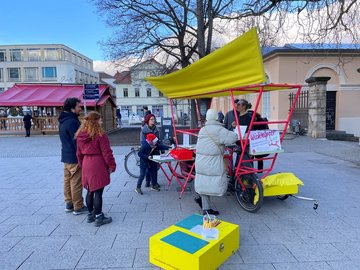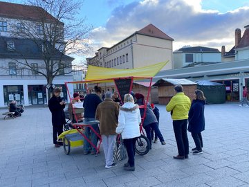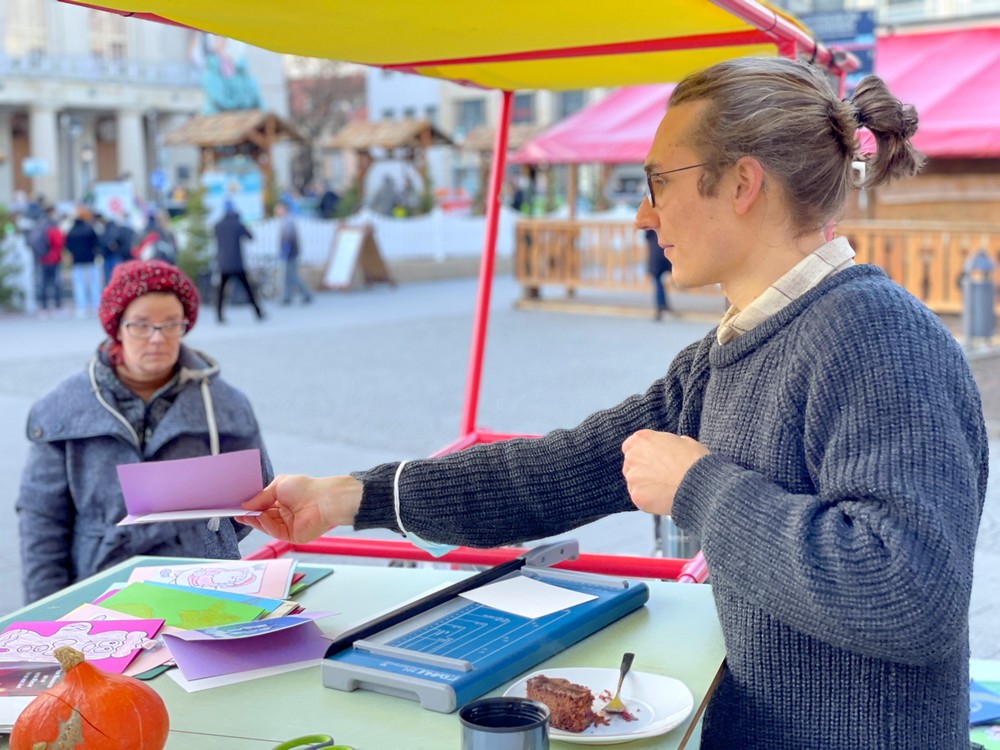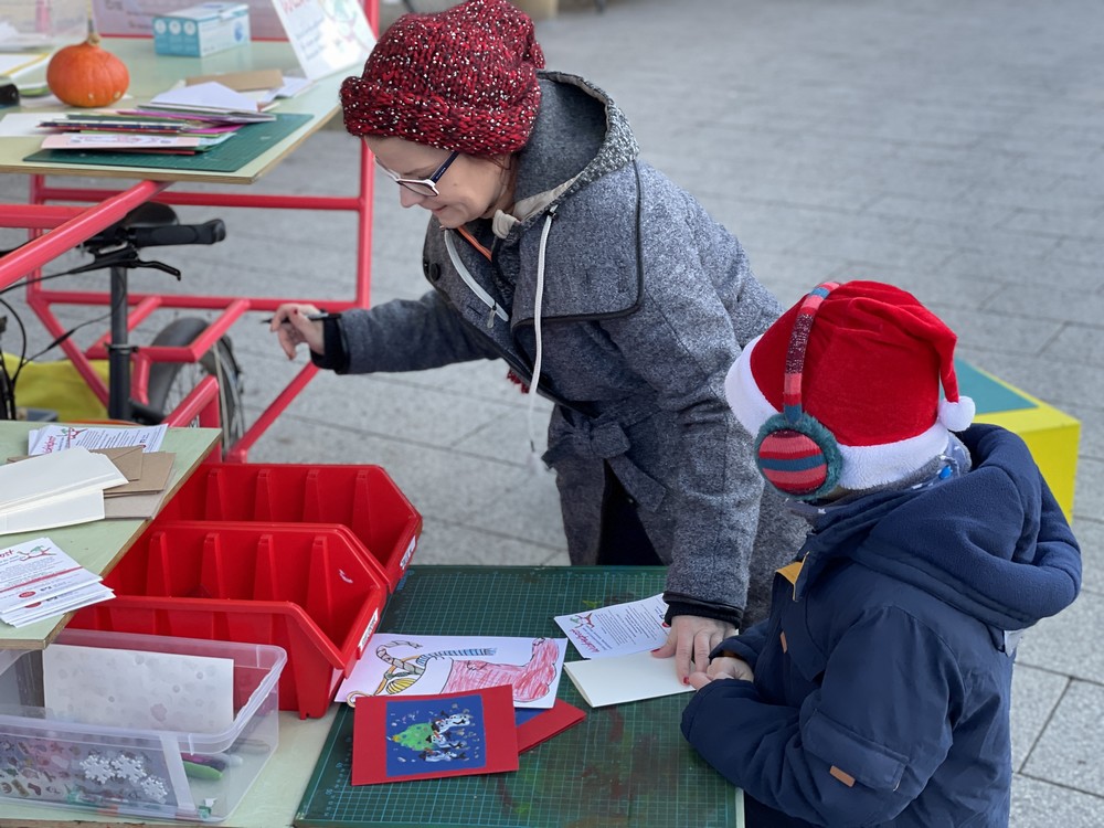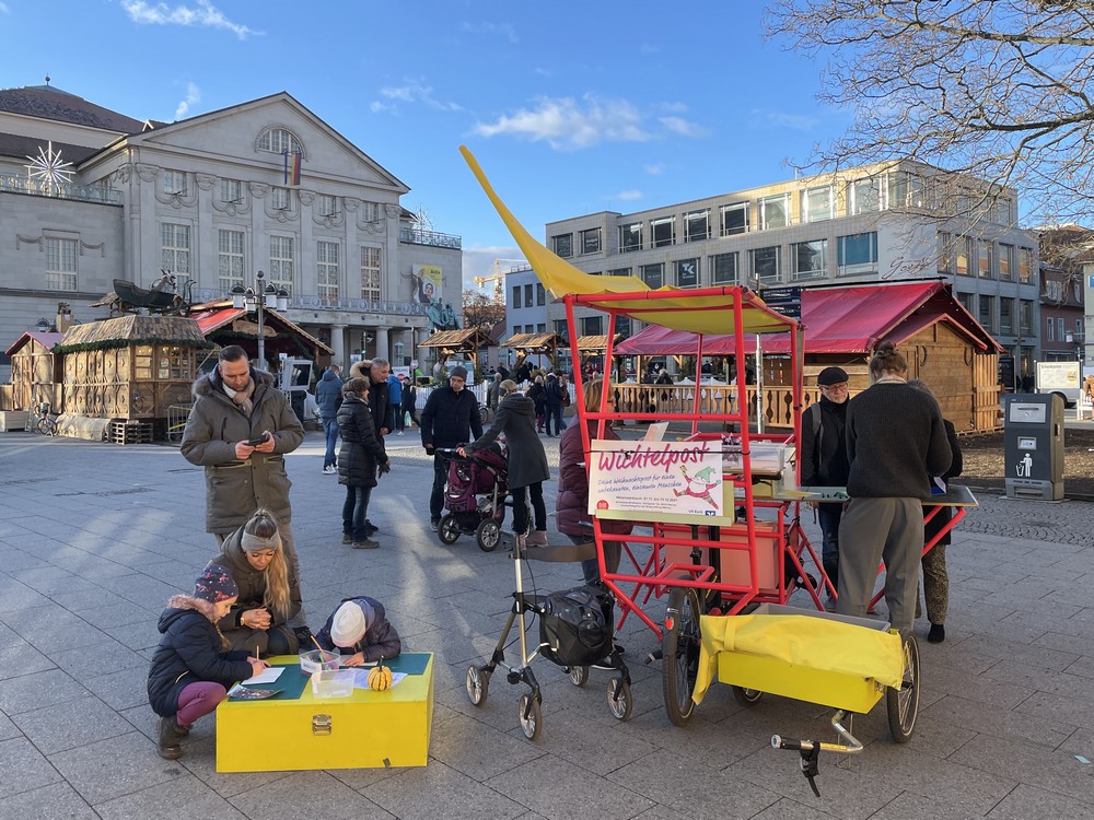 Auch als Briefkasten wurde der außergewöhnliche Stand genutzt und zwei Damen, die die Aktion auch schon im vergangenen Jahr unterstützt hatten, brachten ihre 25 wunderbar gestalteten Karten direkt auf den Theaterplatz.