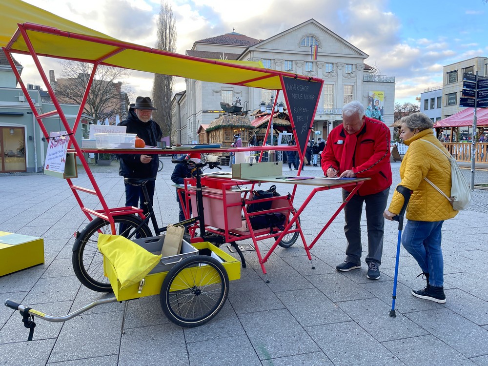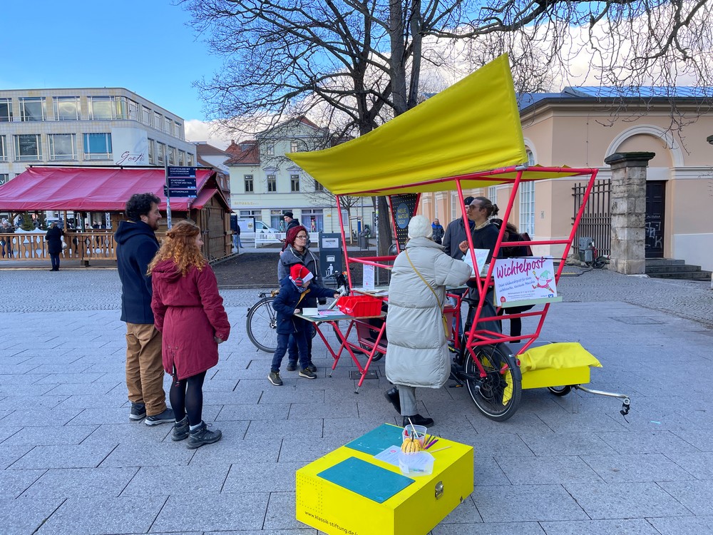 Das Wichtel-Team dankt allen, die sich forsch haben ansprechen lassen und spontan mitgemacht haben. Vielen Dank für den Einsatz an Silvan Gottschall von der Klassik-Stiftung für die Idee und Betreuung des Stands. Auch Wichtelpost-Initiatorin Daniela Malerz mit Sohn Oskar (7) und Stefanie Lachmann von der Bürgerstiftung Weimar übernahmen Standdienste und sprachen die vorbeiziehenden Menschen an.