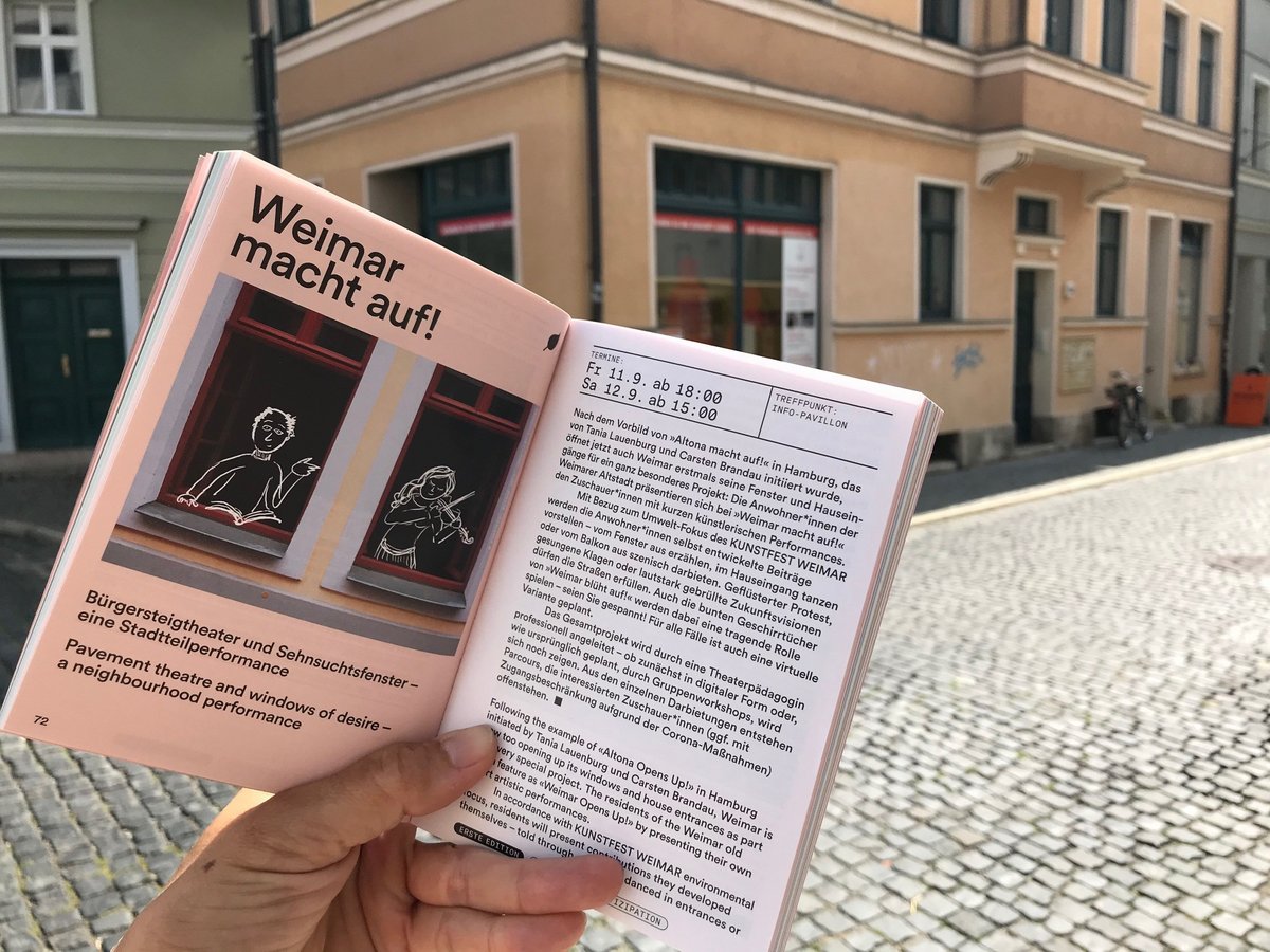 Die KUNSTFEST-Gäste werden auf Stadtrundgang geschickt und mit kreativen Beiträgen zum Thema Klimaschutz- bzw. Umwelt an verschiedenen Stationen unterhalten – vom Fenster aus erzählt, im Hauseingang getanzt oder vom Balkon aus szenisch dargeboten. Sängerin Stephanie Brill präsentiert zwei ihrer Eigenkompositionen aus der Tür der Bürgerstiftung heraus.