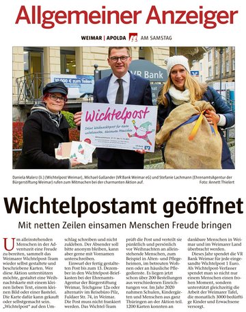 Am 27.11. war unsere Aktion auf dem Titel des Allgemeinen Anzeigers. Wir hoffen, dass das für einen ordentlichen Kartenschub sorgt. Es lohnt sich, denn wie Ihr wisst, spendet die VR Bank 1€ für jede Wichtelpost, die bei uns eintrifft.