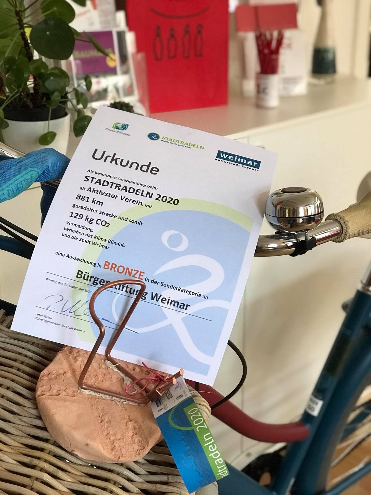 Das Team der Bürgerstiftung belegt in der Kategorie radelaktivster Verein Platz 3. Tobias Keppler, Beauftragter der Stadt für Klimaschutz und Nachhaltigkeit, überbrachte uns persönlich die Urkunde und den von der Landenberger Schülerfirma gestalteten Preis. Vielen Dank!