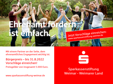 Der Bürgerpreis ist mit insgesamt 5.000 Euro dotiert und wird im Rahmen einer Feierstunde am 9. Dezember 2022 übergeben. . Vorschläge können über ein Online-Formular auf der Internetseite der Sparkassenstiftung www.sparkassenstiftung-weimar.de eingereicht werden. Bewerbungsende ist der 31. August 2022.