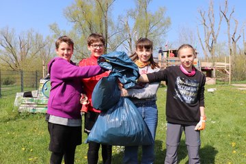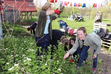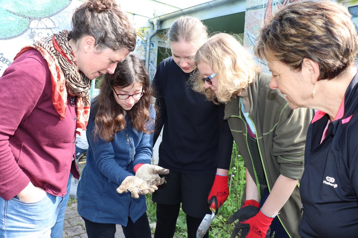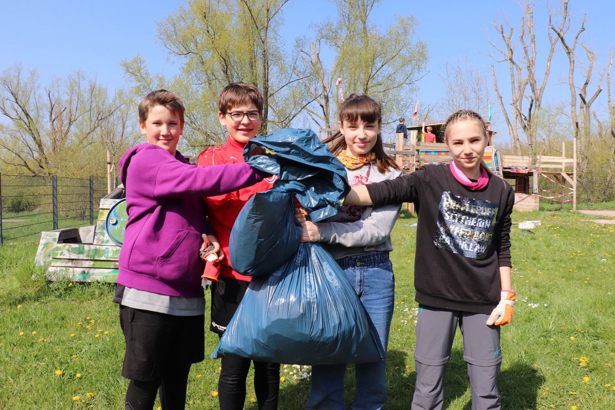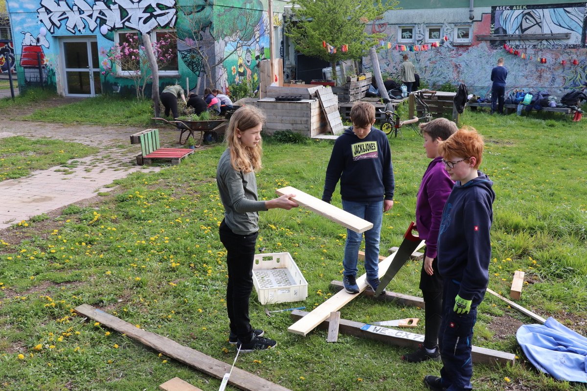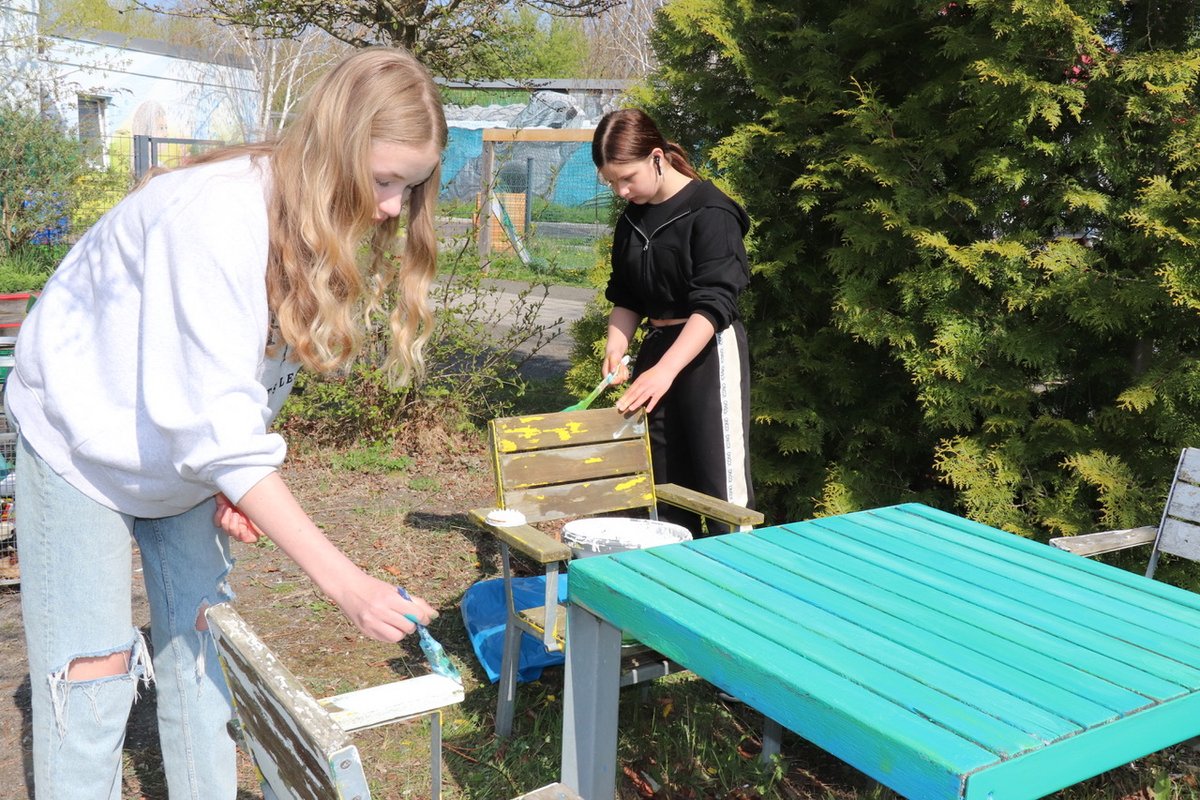 Clubleiterin Julia Boronczyk und Erzieherin Victoria Kühn betreuten die jungen ehrenamtlichen Helferinnen und Helfer, die bei strahlend schönem Frühlingswetter mit Feuereifer und viel Elan in Gruppen im Kramixxo, doch vor allem auf dem Außengelände arbeiteten. Am Ausflugstag des Goethegymnasiums wollten die Schülerinnen und Schüler der 7b „Gutes tun“, berichtet ihre Klassenlehrerin Hannah Ziegler über die Motivation der Kinder. Keines von ihnen kannte den Jugendclub bis dato persönlich.