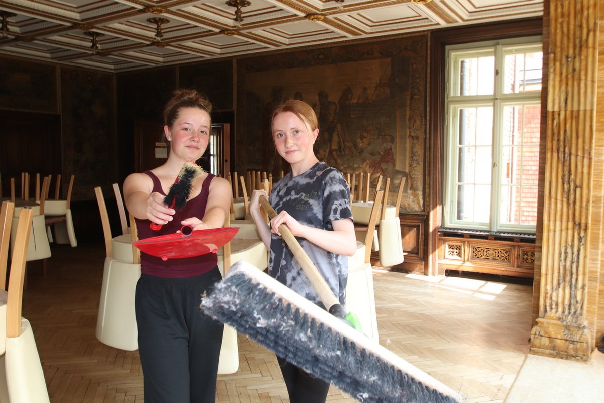 Die Klasse 7a des Friedrich Schiller Gymnasiums Weimar um Klassenlehrerin Anna Keller und ihrer Stellvertreterin Jessica Aniol legten tatkräftig mit Hand an: Wege wurden von Unkraut befreit, geschnittene Äste und Zweige beiseite geräumt, Müll gesammelt, im Herrenhaus geputzt und gefegt und gewischt. 28 hoch motivierte Jugendliche schaffen viel.