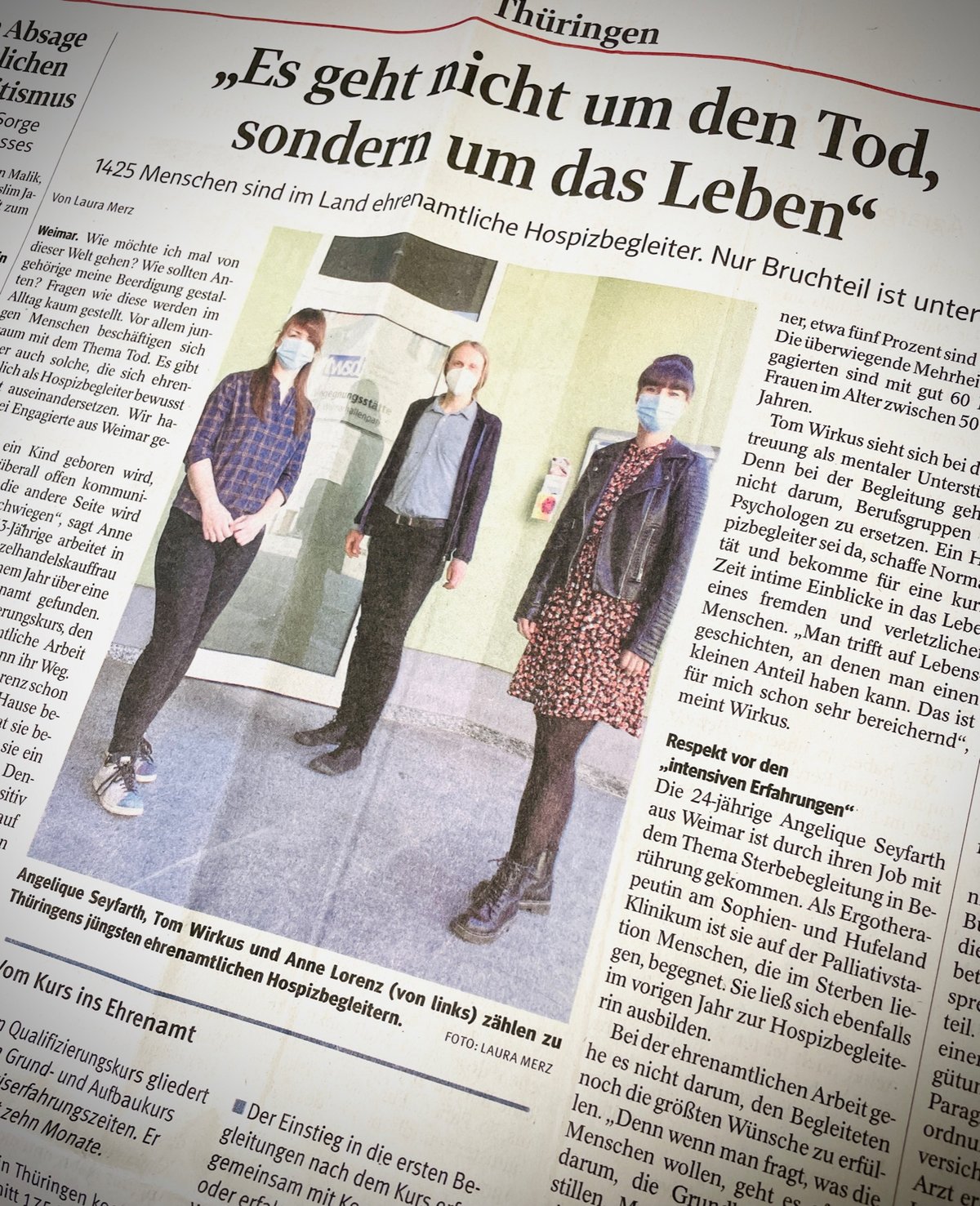 Sehr gefreut haben sich Stefanie und Anja, Koordinatorinnen der EhrenamtsAgentur, über Tom und Anna (Bericht in der TLZ vom 22.5.), die nach dem Besuch der Agentur im Ehrenamt angekommen sind. Und nicht nur in irgendeinem. Beide gehören jetzt zu den jüngsten ehrenamtlichen Hospizbegleitern des Trägerwerks Soziale Dienste.