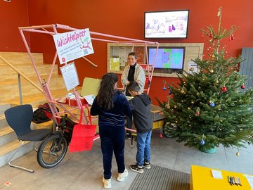 Das Fahrrad, das als mobile Schreib- und Bastel-Station von der Klassik-Stiftung Weimar zur Verfügung gestellt worden war, passte glücklicherweise gerade so ins Foyer.