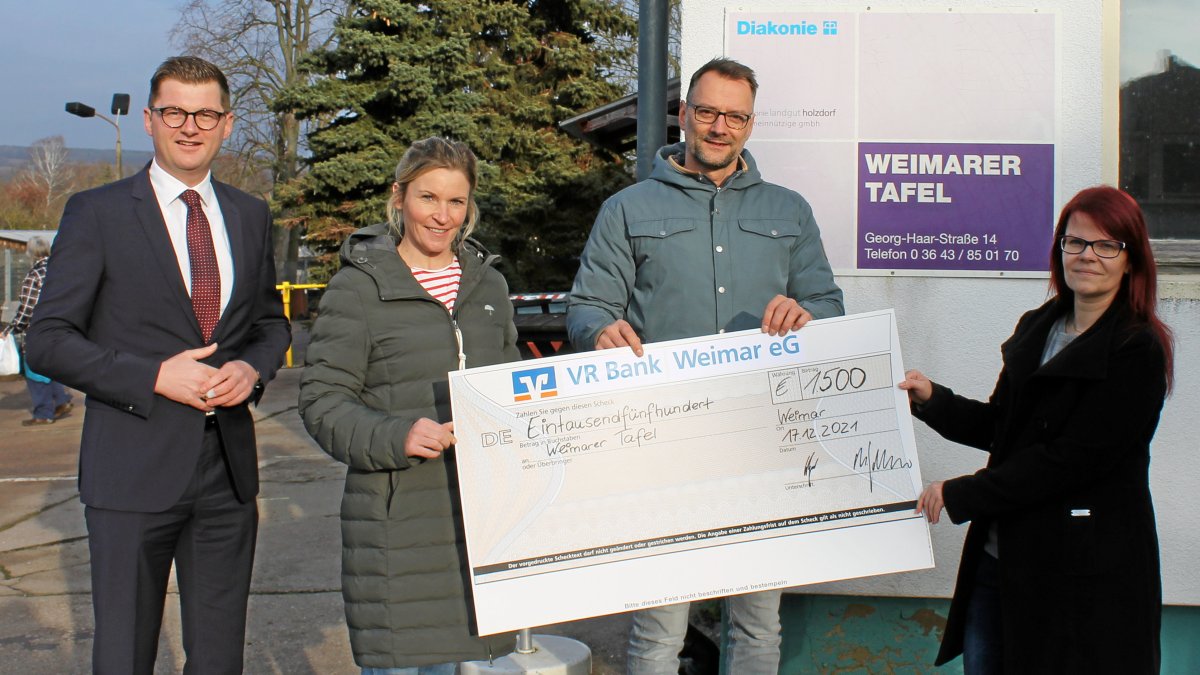 Weimar. Eine Spende in Höhe von 1500 € hat die VR Bank Weimar am Freitag an die Weimarer Tafel übergeben. Die Genossenschaft hatte sich im zweiten Jahr der Wichtelpost-Aktion der EhrenamtsAgentur im Vorfeld dazu bereiterklärt, für jeden Brief einen Euro an die Tafel zu übergeben.
