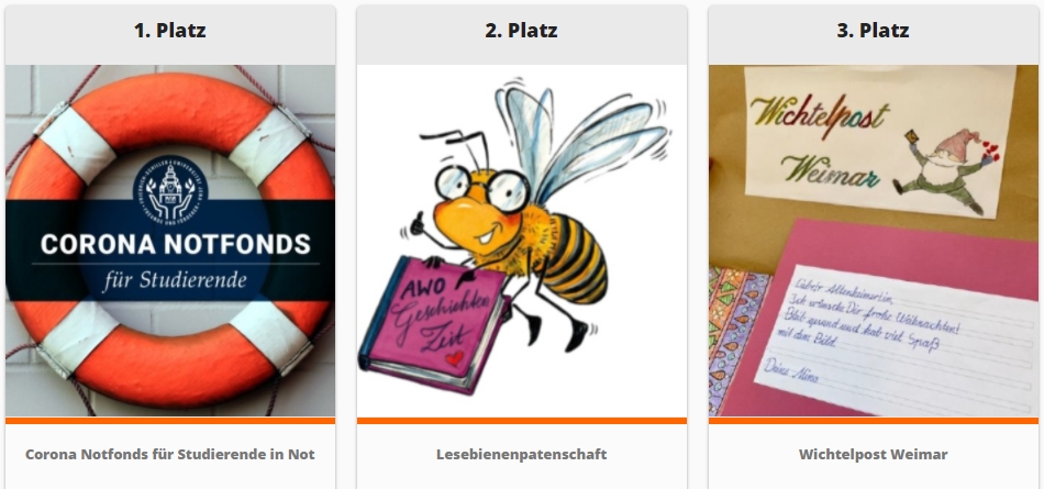 Der Corona-Notfonds für Studierende in Not der Gesellschaft der Freunde und Förderer der Friedrich-Schiller-Universität Jena erhält den ersten „Mitteldeutschen Fundraisingpreis“, dotiert mit 1.000 Euro. Der zweite Preis mit 500 Euro geht an die Lese-Bienen-Patenschaft der AWO Halle-Merseburg, die Ehrenamts-Agentur der Bürgerstiftung Weimar erhält den dritten Preis mit 300 Euro für ihre Wichtelpost. Die Preise wurden beim Mitteldeutschen Fundraisingtag vergeben, der erstmals als Online-Tagung stattgefunden hatte. Aus allen Bewerbungen waren im Vorfeld drei Projekte ausgewählt worden. Die Teilnehmenden des Fundraisingtages ermittelten die Platzierungen mittels Direktabstimmung.